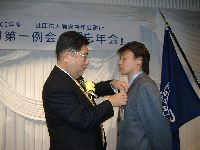 | 理事長バッジ交換!! | 直前理事長バッジ交換後の笑顔!二人とも本当に良い笑顔ですね!! | 来年にむけて抱負を語る次年度! |
